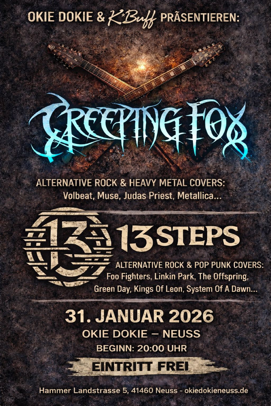 Danke an die Veranstalter und Organisatoren des STEINBRUCH-DUISBURG. Wir wurden gebeten, für die Absage einer anderen Band einzuspringen, und das haben wir auch gerne getan. In der Kürze der Zeit konnten wir sogar noch einen Song der absagenden Tribute Band-Vorlage einstudieren, zudem noch ein Song, der schon seit den Anfängen von CREEPING FOX auf unserer Wunschliste stand und nun den Weg ins Stamm-Repertoire gefunden hat: Led Zeppelin's IMMIGRANT SONG!